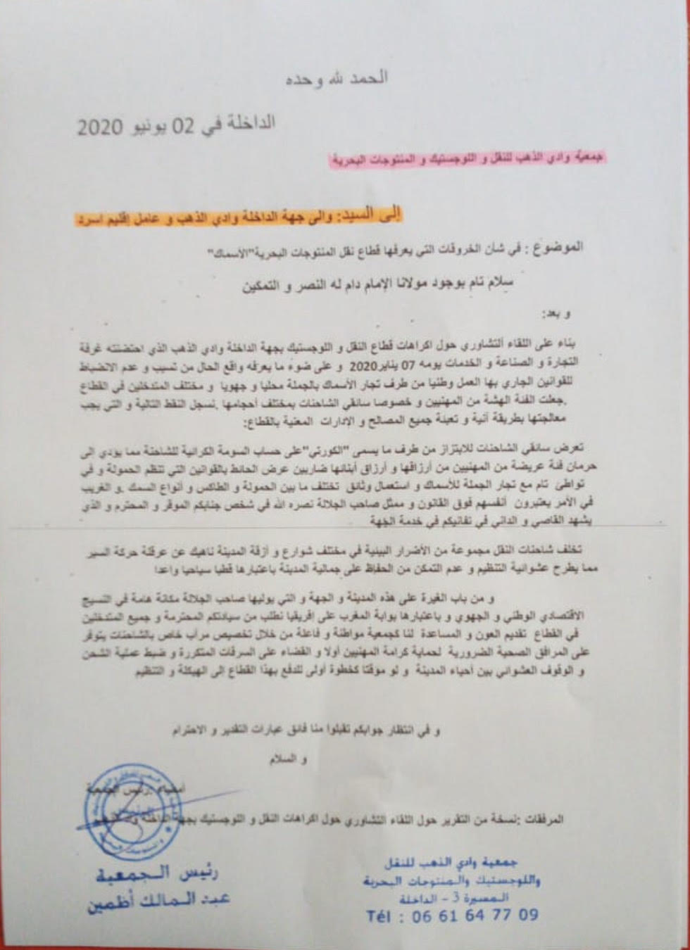 جمعية وادي الذهب للنقل واللوجيستيك والمنتوجات البحرية تراسل والي الجهة لمين بنعمر حول الخروقات التي يعرفها قطاع نقل المنتوجات البحرية..