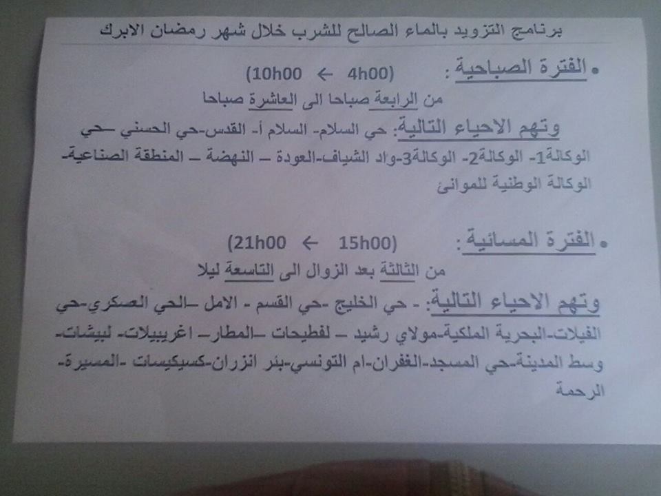 هذا هو برنامج تزويد احياء مدينة الداخلة بالماء الصالح للشرب خلال شهر رمضان 22 يونيو 2015 الساعة 9 و 12 دقيقة شارك برنامج تزويد احياء مدينة الداخلة بالماء الصالح للشرب خلال شهر رمضان شارك